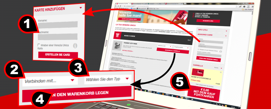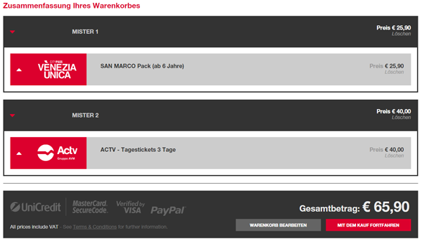 Wiederholen Sie diesen Vorgang für die Personen, die mit Ihnen nach Venedig reisen. Sie können diesen Vorgang, jederzeit durchführen. Wenn Sie mit Ihrem Smartphone oder dem Tablet die Seite besuchen, klicken Sie auf die Taste „+“ in der oberen rechten Ecke, um das Drop-Down-Menü „Karte hinzufügen“ und „Warenkorb“ zu öffnen - Wählen Sie die Karte der Person, für die Sie ein Produkt erwerben möchten;