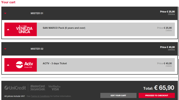 On the Cart list page you will be able to check and/or change your purchases, or continue.