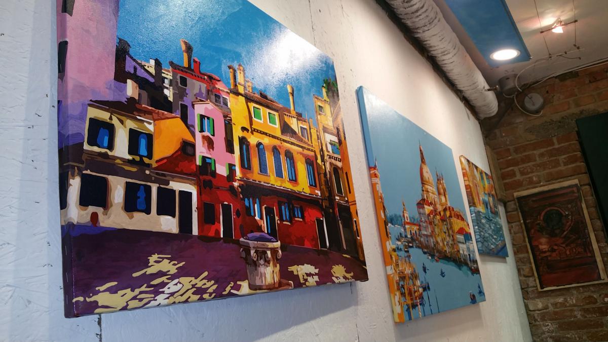 Dipinti originali di vedute di Venezia e maschere della "Commedia dell’Arte"