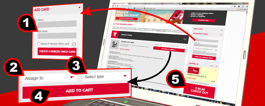 • To create the Card, fill in your name and surname in the “Add Card” box in the right-hand column, and click on “CREATE CARD” to 'create' your Venezia Unica card. If travelling with others, repeat the process for each person to create their Cards. You may do this at any time during the purchase session.