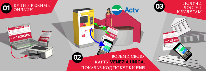 Чтобы воспользовать транспортными средствами, ты можешь получить оплаченные проездные документы, введя персональный код бронирования  PNR, в кассах-автоматах ACTV или, показав свой ваучер (код бронирования PNR), в одном из многочисленных Пунктов продажи в городе. У тебя будет карта, с которой ты сможешь пользоваться городскими транспортными услугами.